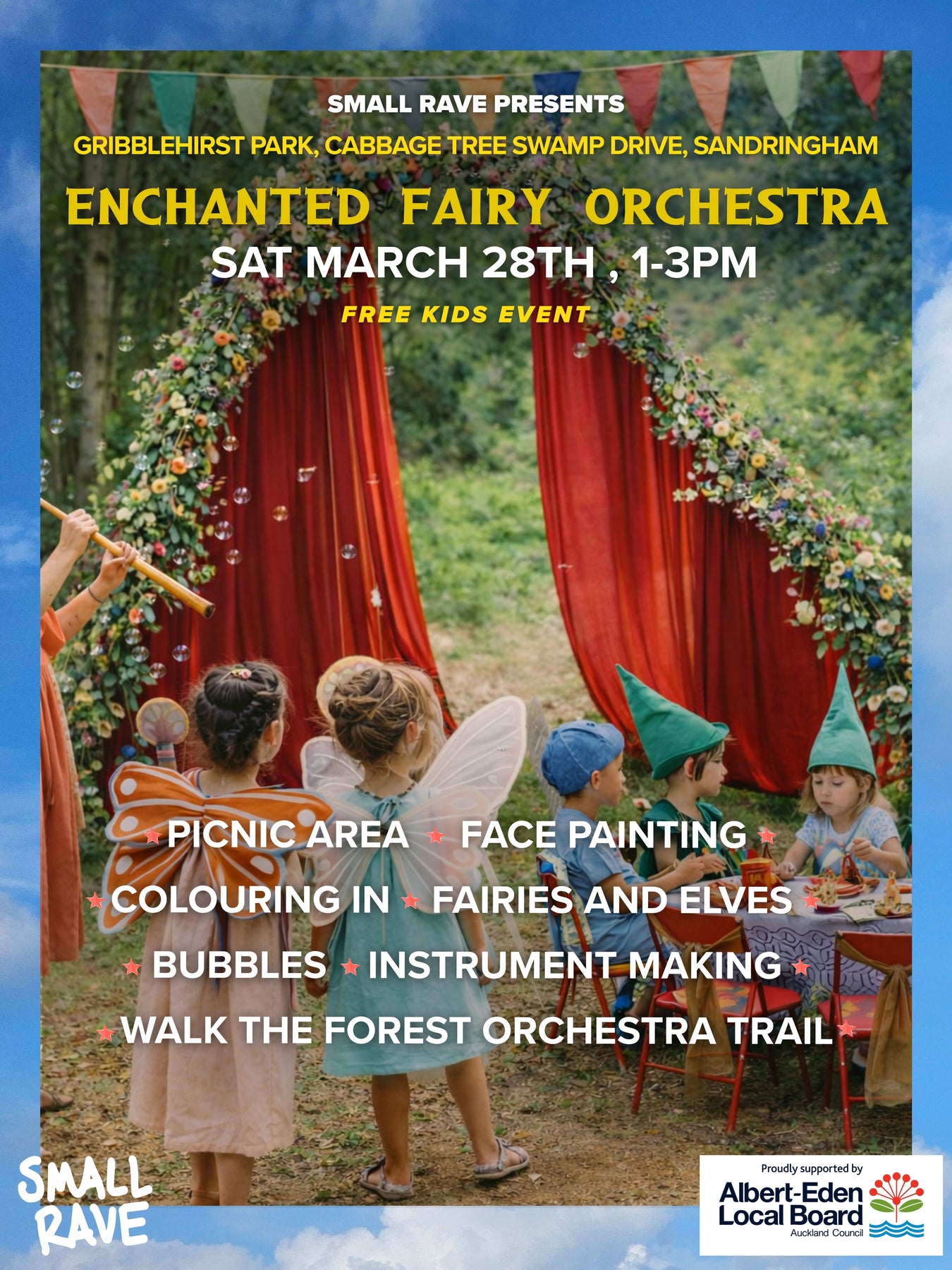 SMALL RAVE INVITES TAMARIKI AND WHĀNAU TO A FREE, MYSTICAL AFTERNOON IN GRIBBLEHIRST PARK’S ENCHANTED LAVA FOREST. FOLLOW THE TREASURE MAP TO DISCOVER THE HIDDEN FAIRIES AND ELVES PLAYING INSTRUMENTS THAT MAKE UP THE ENCHANTED ORCHESTRA AND CRAFT YOUR OWN SPELL-STIRRING INSTRUMENTS ALONG THE WAY.