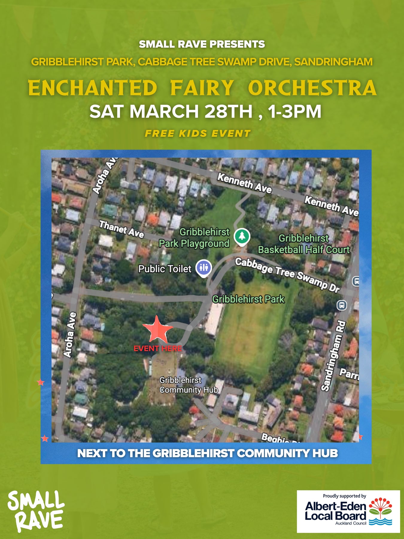 FREE, NO TICKET REQUIRED. - 1-3PM - GRIBBLEHIRST PARK, LAVA TRAIL NEXT TO THE HUB, CABBAGE TREE SWAMP DRIVE, SANDRINGHAM, 1025.
