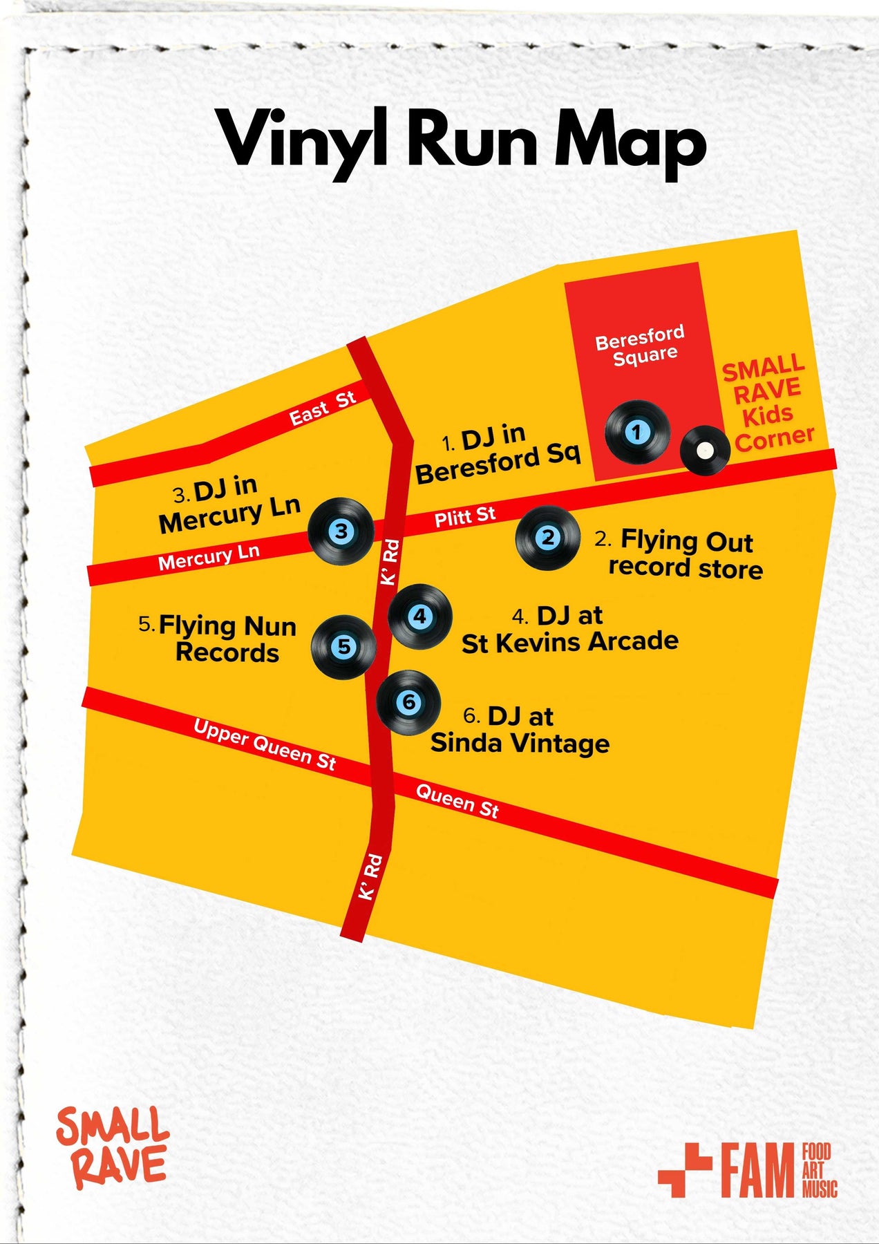 SWING BY THE SMALL RAVE KIDS CORNER TO PICK UP YOUR VINYL PASSPORT, THEN HIT THE STREET TO EXPLORE. TRACK DOWN ALL FOUR DJ SETUPS AND TWO RECORD STORES, ADDING A STICKER ON YOUR PASSPORT ALONG THE WAY.
